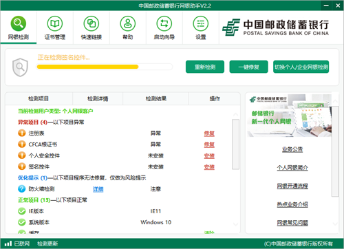 邮储银行网银助手软件是中国邮政银行专门推出的网银软件,辅助用户可以更好地操作网银,能够一键完成环境检测,你可以进行环境的修复、缺少控件的安装等等,功能丰富而且实用!这款助手让你可以轻松地使用中国邮政储蓄银行的个人网上银行和企业网上银行,帮助您更顺利地登录邮储网上银行,更快捷的打开邮储网上银行的网页,还可以一次性完成所有控件、驱动程序安装。使用邮储网银助手,您可以通过一键修复功能,来安装网银安全控件和UK驱动程序、优化调整您的IE浏览器设置,为您解决密码无法输入、UK无法识别、部分页面无法打开等问题,有效的节省您的时间,方便您的操作。
