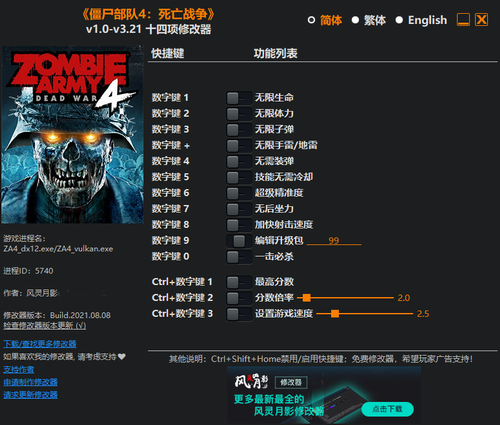 僵尸部队4死亡战争十四项修改器 风灵月影版软件截图