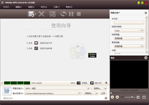 4Media MP4 Converter是一款专业好用的MP4视频转换器,这款软件支持将WMV、MOV、MKV、RM、VOB、3GP和AVI等视频格式转换为MP4视频文件,而且转换效率非常高,还可以设置输出参数更改视频效果,绝对是用户必备的视频转换工具。4Media MP4 Converter支持预览功能,用户设置好转换格式和大小、质量、比特率、帧率等参数后即可预览转换后视频,用户只需导入需要转换的文件,选择MP4输出预设,即可一键转换,非常好用。