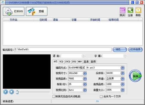 易杰DVD转VCD转换器是一款功能强大的DVD转换输出VCD视频的软件,可以把DVD光盘快速高质量地转换输出VCD,SVCD,MPEG,AVI视频格式,您可以根据需要来设置视频的制式等来满足不同国家,不同要求的VCD视频文件,输出文件可以直接使用刻录软件刻录成VCD视频光盘,在VCD、DVD等支持VCD视频播放的设备中播放。它可以从DVD光盘中选择任何字幕和音频与DVD视频一起转换输出,可以单独转换输出您想要的精彩片段,还可以把多个片段合并成一个DVD标题/章节。