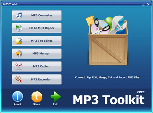 MP3 Toolkit是一个简单的MP3六合一工具箱,可以进行MP3格式转换工具,CD音乐抓轨工具,MP3标签信息编辑工具,多首MP3合并工具,MP3剪辑工具以及MP3录音工具。