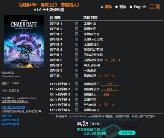 战锤40K混沌之门恶魔猎人修改器风灵月影版功能按键描述:
