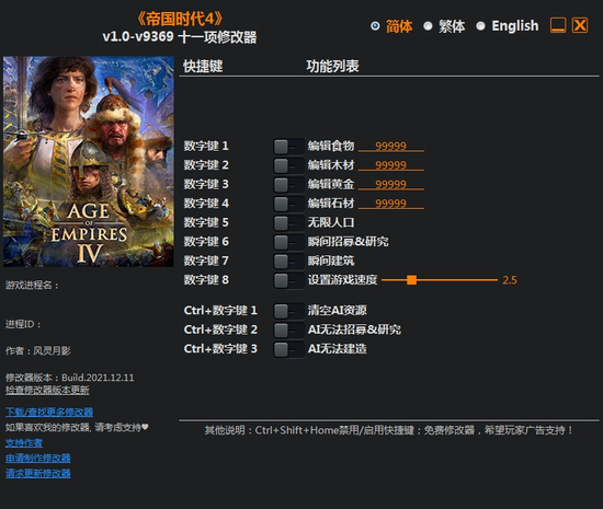 《帝国时代4十一项修改器风灵月影版》是战争策略类游戏帝国时代4的修改器。本修改器拥有AI无法招募&研究、AI无法建造、瞬间招募&研究、瞬间建筑、编辑黄金、清空AI资源、编辑石材等十一项游戏数据修改功能,可以帮助用户在这个广阔的世界中发展出最为强大的文明。