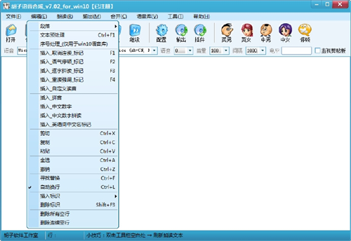 3、软件提供了四种角色:英文男声、英文女声、中文男声、中文女声(当然前提是您已经安装的相应的语音库),默认标识符为“英男 ”、“英女 ”、“中男 ”、“中女 ”,你可以很方便地通过工具栏按钮、右键菜单、快捷键等三种方式中的任何一种,将标识符插入到文本中,这样就可以实现中英文、男女声对话。