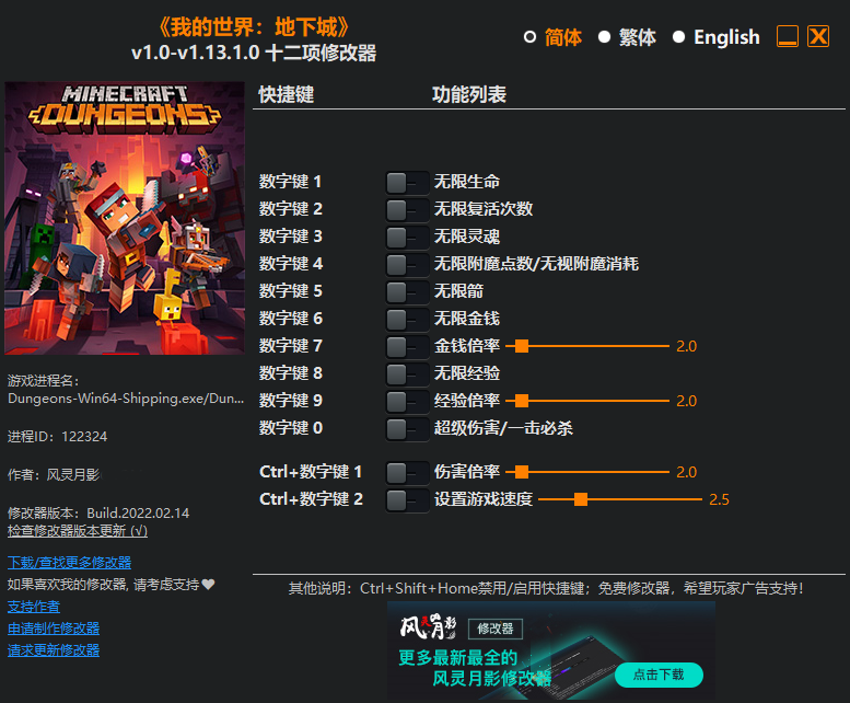 我的世界地下城十二项修改器风灵月影版功能描述: