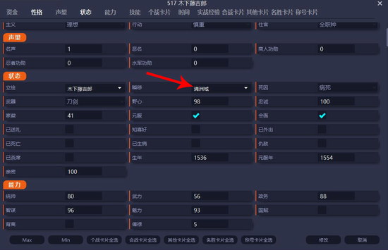 3、找到【状态】→【瞬移】选项栏,通过下拉菜单搜索选择想要前往的城池。(注意现阶段只支持城池瞬移,不包含町、里、砦)。