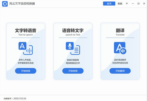 1、双击软件进入风云文字语音转换软件操作页面,该页面可以进行文字转语音、语音转文字和语言翻译三个功能;