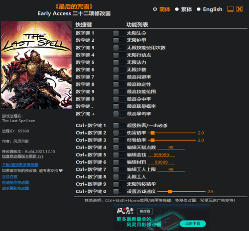 最后的咒语二十二项修改器风灵月影版功能描述: