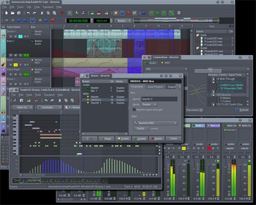 QTractor允许你拖、移动、拽、剪切、复制、粘贴、重粘贴、删除、分割和合并。它提供无限制的撤销/重做操作,具有内置的音频接线台,和更多其它功能。对于那些既想拥有Jack的强大性能又不希望拥有Ardour的复杂性(或灵活性和特色设置)的人,QTractor是一个很不错的解决方案。QTractor只能用于Linux系统。