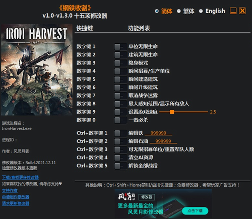 钢铁收割十五项修改器风灵月影版功能介绍: