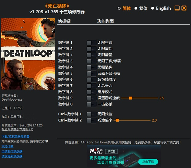 死亡循环十三项修改器风灵月影版功能描述: