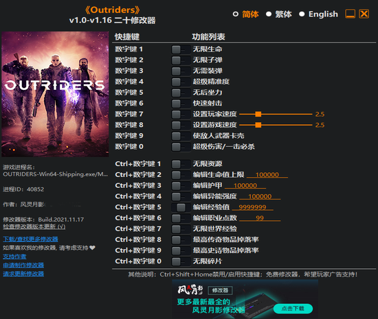 《Outriders二十项修改器风灵月影版》是一款根据同名游戏“Outriders”改编制作而成的修改器,在游戏中,未知的星球和未知的危险也在等待着他们,这里的原著居民异星怪兽便和人类发生了战斗,为了让玩家可更好的体验这款游戏,本次带来了Outriders二十项修改器这款辅助工具,玩家们使用这款修改器就可以修改自身的属性,不再受到游戏规则的限制,可以更好的体验游戏的剧情,不用担心过不去了。