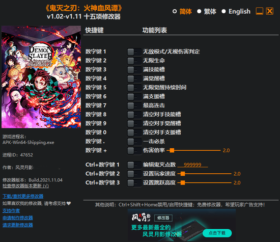 鬼灭之刃火神血风谭修改器风灵月影版功能描述: