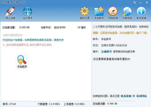 27加速器是网络游戏通用的网游加速器,继承了27魔兽加速器的优点,而且提供给玩家使用。魔兽加速器全天免费试用,付费后使用不满意可退款,不使用可暂停计费,买魔兽充值卡奖励加速器时间;针对魔兽以外的其他网络游戏提供加速器。