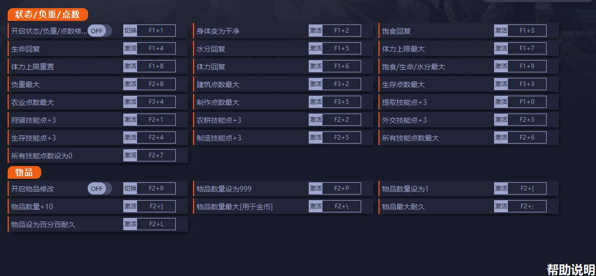 1、开启状态/负重/点数修改:负重修改,当前负重若超重,修改后丢弃1个物品更新负重,重新存档读档可还原负重。