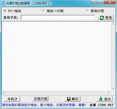 2、因为IP地址数据是民间收集的,电信也会不时的更改IP段,所以有点遗漏、错误是难免的。随数据库附送IP解压,查询软件。
