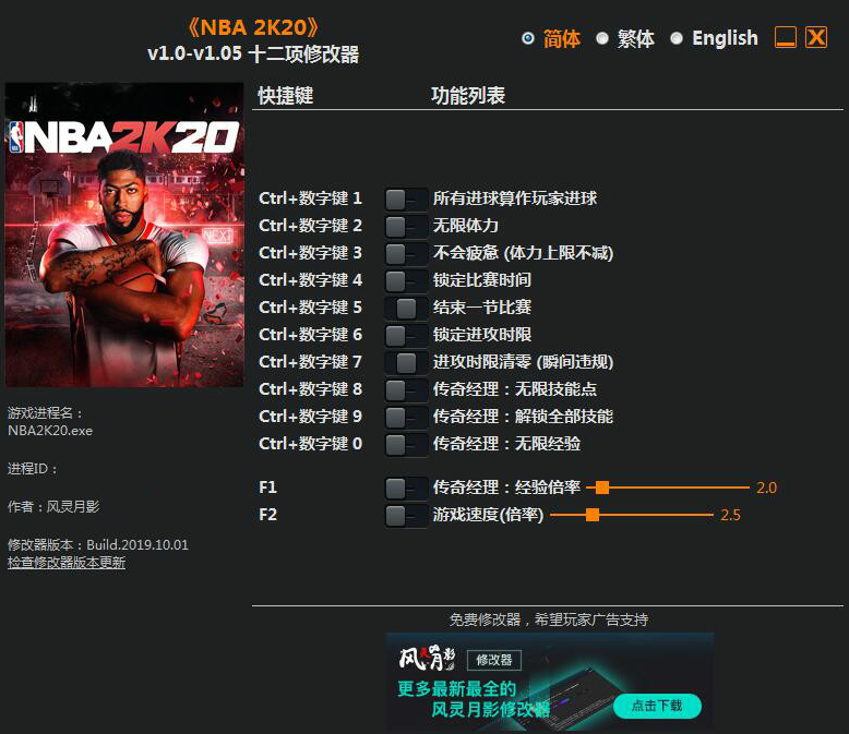 《NBA 2K20修改器风灵月影版》是一款根据同名游戏“NBA 2K20”改编制作而成的修改器,它能帮助玩家对游戏中的各项球员属性进行修改,这其中包括:所有进球算作玩家进球、无限体力、不会疲惫、锁定比赛时间、结束一节比赛、进攻时限清零、传奇经理:无限技能点、传奇经理:解锁全部技能等十二项主体功能等,让你随心所欲掌控游戏比赛走势,如果你兼具喜欢NBA和该游戏的话,就会发现游戏中的明星球员们的技术特点是尽可能还原球星们的真实动作。