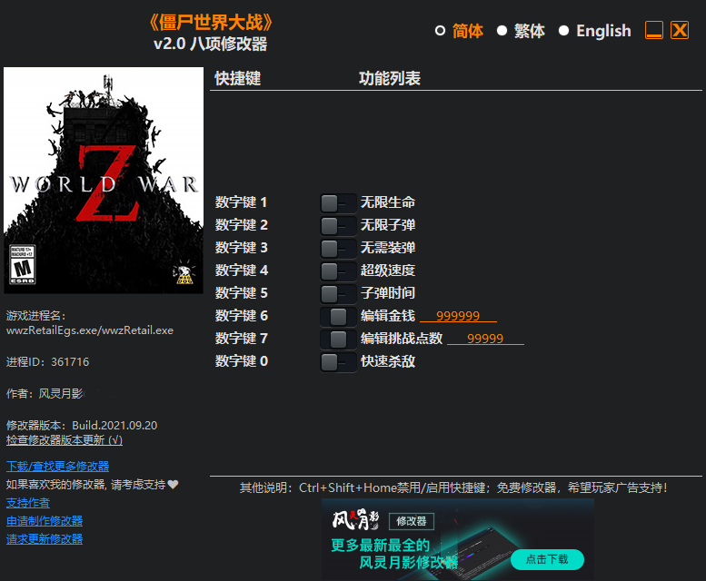 僵尸世界大战修改器风灵月影版按键操作描述: