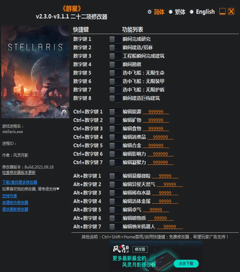 《群星二十二项修改器风灵月影版》是一款非常流行的经营策略类游戏群星的修改器,本修改器内拥有瞬间建造巨构建筑,瞬间完成研究,工程船瞬间完成建筑,选中飞船:无限生命,编辑能源,编辑纳米机器人等二十二项游戏数据修改功能,可以帮助用户在这广阔的宇宙之中打造出属于自己的银河帝国,此外在游戏中拥有着许多不确定的因素,比如玩家发展的好好的,突然一只星际怪兽出现在您的面前,直接将玩家的前期所有努力给摧毁掉,但有了本修改器就不同了,游戏中的编辑能源,瞬间建造功能,可以帮助您在前期就建立起强大的帝国,在这宇宙中进行最为爽快的游戏体验。