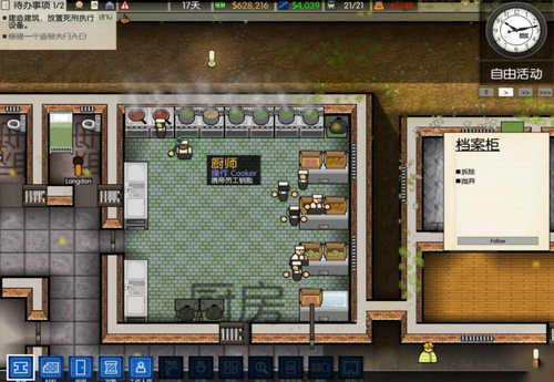 2、厨房分配工作,需要用典狱长在行政解锁后勤,解锁后勤要雇佣一个工头,工头解锁狱中劳役。