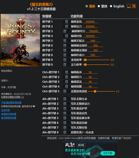 《国王的恩赐2修改器风灵月影版》是一款针对该游戏而制作的辅助工具,可以有效的降低游戏难度,提升游戏体验;比如可以直接编辑金钱数目、法力、领导力、天赋点、魔法强度等等;甚至还可以直接修改为“无限生命”,让你在游戏中可以处于无敌状态,非常好用,而且修改器的使用也非常简单,游戏中你只需要按下相关的快捷键即可实现。