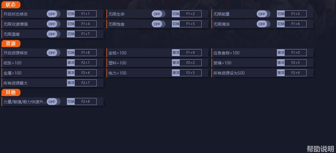 1、开启状态修改:在营地[垃圾之家]开启。无限生命/能量战斗不生效。