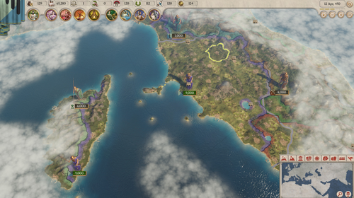 1、进入游戏后首先选择国家,游戏推荐的强国是罗马,埃及,迦太基,马其顿,塞琉古,弗里几亚。这些国家开始就拥有比较强势的国力也占据了比较好的地理位置,自然玩家也可以在地图上点击其他喜欢的国家玩。每个国家自带的法律和特点要务必看清楚。