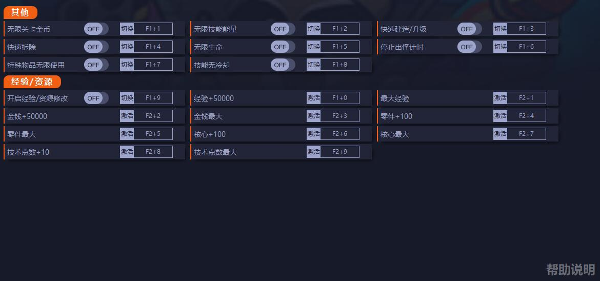 1、开启经验/资源修改:开启后,在选择星球界面点击机库[Hangar]或按1键进入机库界面修改经验/资源,修改后任意一种资源变动刷新数值,经验修改在下次获得经验时更新等级。