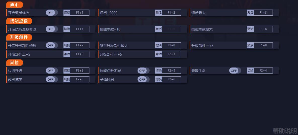 2、开启通币修改/开启技能点数修改/开启升级部件修改:开启后,打开角色界面[Tab]修改,修改后重新打开角色界面[Tab]刷新。