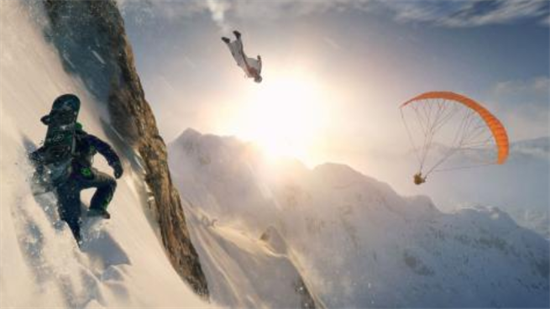 2、玩法多样,这里你可以玩到单板,双板,翼装,动力伞,入了dlc你还可以玩雪橇,跳伞,高速滑雪,飞行器。