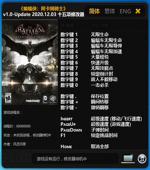 蝙蝠侠阿甘骑士十五项修改器风灵月影版功能介绍: