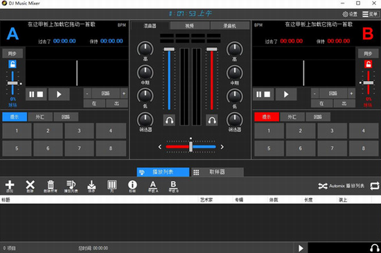 5、录制混音并保存为音频文件,专辑图片显示,每个甲板上的图形均衡器,跟踪进度波形,能够自定义播放列表,快速预览音乐和视频混合。