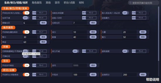 1、开启生命/体力/经验/光环修改:在场景中开启使用。