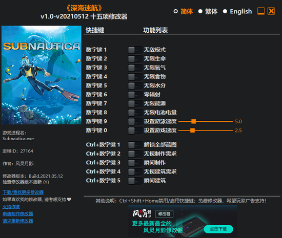 《深海迷航十五项修改器风灵月影版》是一款专门针对深海迷航游戏量身定制的游戏修改器辅助软件,完全支持游戏兼容,旨在为广大玩家在玩游戏的时候带来更好的游戏体验,修改器支持修改各种模式,要知道这是一款深海游戏,在海里面,无限氧气那是必不可少的,不然游戏体验可不会太友好了,除此之外,还有无限生命、无限食物、无限水分、无限能源、零辐射等等修改功能,让你在这个游戏里可以处于无敌的状态,拥有极致的游戏体验。