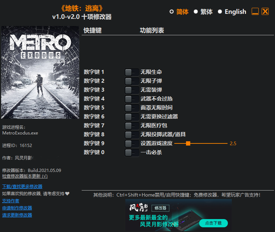地铁离去修改器风灵月影版功能描述: