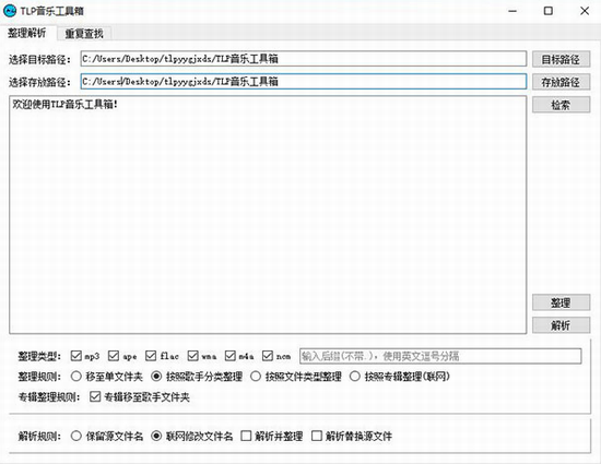 4、可以检索指定目录的音乐文件,手动输入类型后缀,把音乐文件整理至单一文件夹。