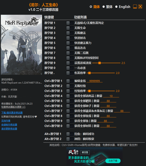 尼尔人工生命升级版二十三项修改器风灵月影版功能描述: