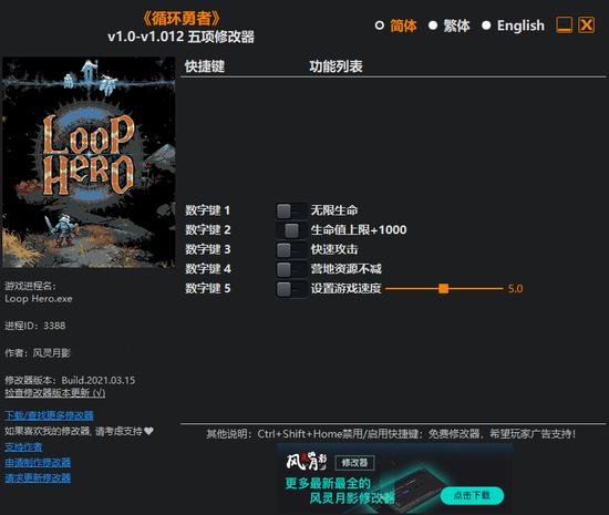 《循环勇者修改器风灵月影版》是一款功能同名游戏“循环勇者”改编制作而成的修改器,本修改器一共拥有生命值上限添加,无限生命,快速攻击,营地资源不减,设置游戏速度等五项游戏数据修改功能,让玩家在这个被巫妖所颠覆的世界中进行最爽快的冒险,最终将这危害世界以久的巫妖给消灭掉,在游戏中,玩家可以为不同职业的英雄获取和装备强大的道具,杀死敌人,扩大幸存者阵营,从而进一步增强英雄在每个周期的冒险保护。