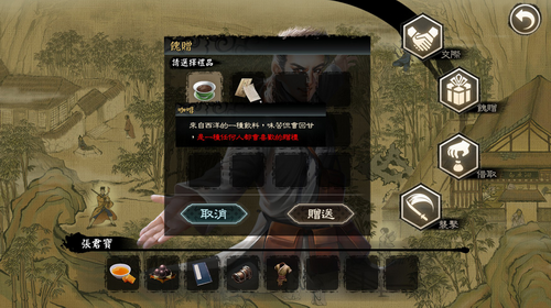 给予栏:放有能够给予其他侠客的物品,在侠客交际界面的赠与中可以使用。
