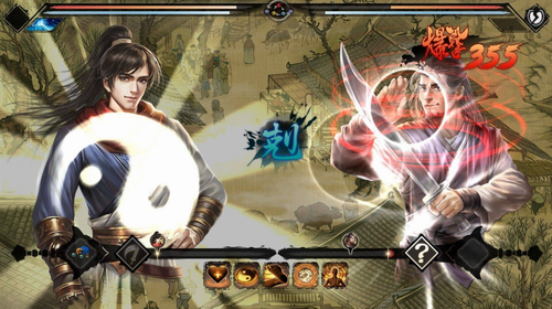 人物上方为血条和内力条,内力条下会显示对手当前状态,使用克制颜色的技能破招可以获得增益效果。克制为红>蓝>黄>红,紫色为相互克制。