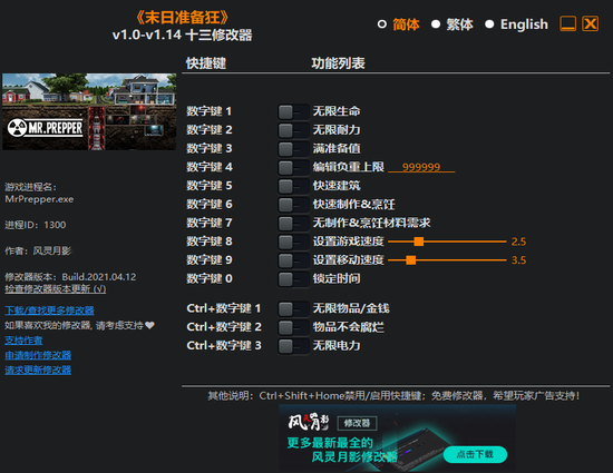 《末日准备狂十三项修改器风灵月影版》是一款针对同名游戏所打造的辅助工具,这款修改器提供了无限生命、无限耐力、无限电力、满准备值、编辑负重上限、快速建筑、锁定时间、设置游戏速度、设置移动速度、无限物品和金钱、无制作和烹饪材料需求等十三项功能,大大的降低了游戏难度,为您带来更好的游戏体验感,简洁的界面设计,操作十分便捷,支持中文简体、繁体和英文等多语言切换。