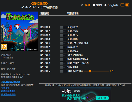 泰拉瑞亚十二项修改器风灵月影版注意事项: