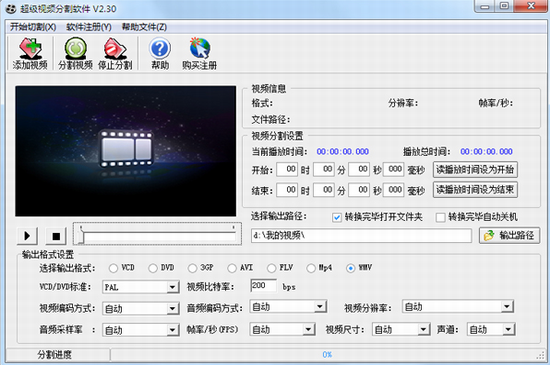 3、支持几乎所有的视频格式分割转换为FLV、AVI、VCD、SVCD、DVD、WMV等格式。