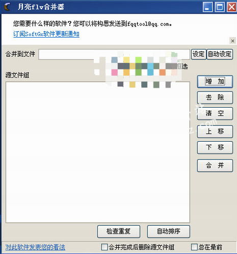 《月亮flv合并器》是一款十分给力且功能强大的flv文件的软件,这款软件的界面简洁,没有多余的复杂功能,使用起来也非常方便,不管是新手还是老手都能够轻松上手操作,同时这款软件可以自定义文件和平顺序,想怎么设置就怎么设置,没有任何拘束,并且这款软件支持从资源管理器将文件拖放到源文件组列表框里,十分方便,不仅如此,它是一款绿色安全无毒的,有需要的用户可以放心下载使用。