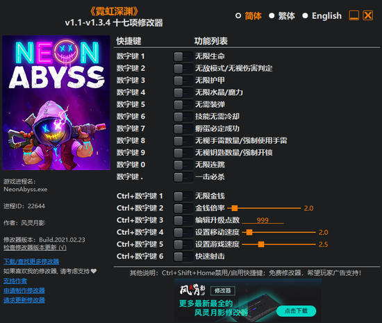 霓虹深渊十七项修改器 v1.1-v1.3.4 风灵月影版