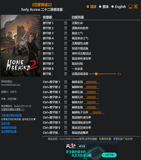 《归家异途2修改器风灵月影版》是一款根据同名游戏“归家异途2”改编制作而成的辅助工具,在对抗时你可以利用游戏当中极为独特的地形或者依靠掩体进行推进,从而解放一个又一个地区,在探索的途中你能够获取到更加多样的武器装备以及载具,你必须对这些装备以及载具加以强化,因为随着小队的不断推荐,敌人的装备将会越来越精良,敌人也会越来越强大,所以对于武器的提升刻不容缓,为了让玩家更好的体验这款游戏,本次带来了归家异途2修改器风灵月影版,有需要的玩家快来下载体验吧。