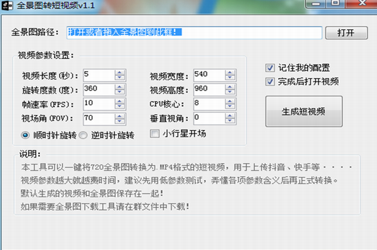 《全景图转短视频软件》是一款功能实用且简单方便的图片转换工具,用户只需将需要转换的全景图导入到工具中,然后通过一系列的参数设置,比如视频长度、宽度、高度、旋转度数、帧速、CPU核心、视场角、垂直视角、开场动画这些设置,并且在生成短视频之前,建议先熟悉各方面的参数再进行生成,否则效果太挫的话会导致事倍功半,一切准备就绪后,点击生成按钮便可完成全景图转换,完成后打开视频欣赏一番,如果觉得满意便可发布于各个短视频平。