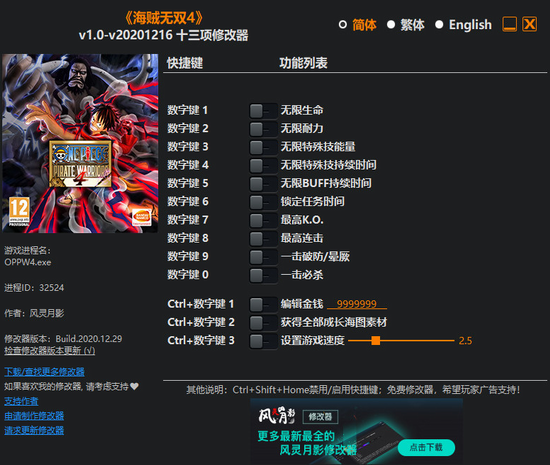 《海贼无双4修改器风灵月影版》是一款专为该海贼王系列游戏而进行制作推出的游戏辅助修改器软件,这款修改器的功能非常的繁多且强大,可以让玩家们非常轻松的就能够通过他来修改这款游戏中的各种数据,使用方法极其简单,能够让玩家们在遇到打不过boss或者是过不去的关卡时候一键修改数据,直接强行过关,非常的暴力简单,并且这款辅助工具拥有像无限生命、无限体力、无限贝利、最大连击、技能无冷却等等诸多功能选项,此外这款辅助工具绝对安全、无毒、无广告,诸位用户们可以放心下载。