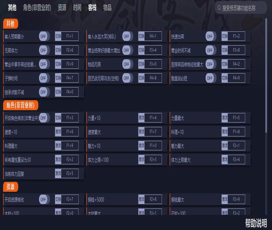 3、开启修改器各主初始项再使用各子修改项[无主初始项则不用开启][主初始项:如开启...修改]。