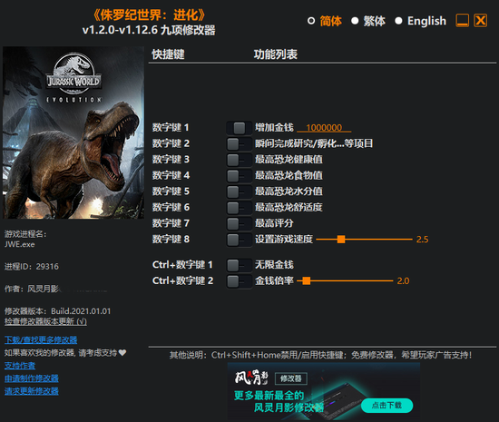 侏罗纪世界进化修改器 v1.2.0-v1.12.6 风灵月影版软件截图